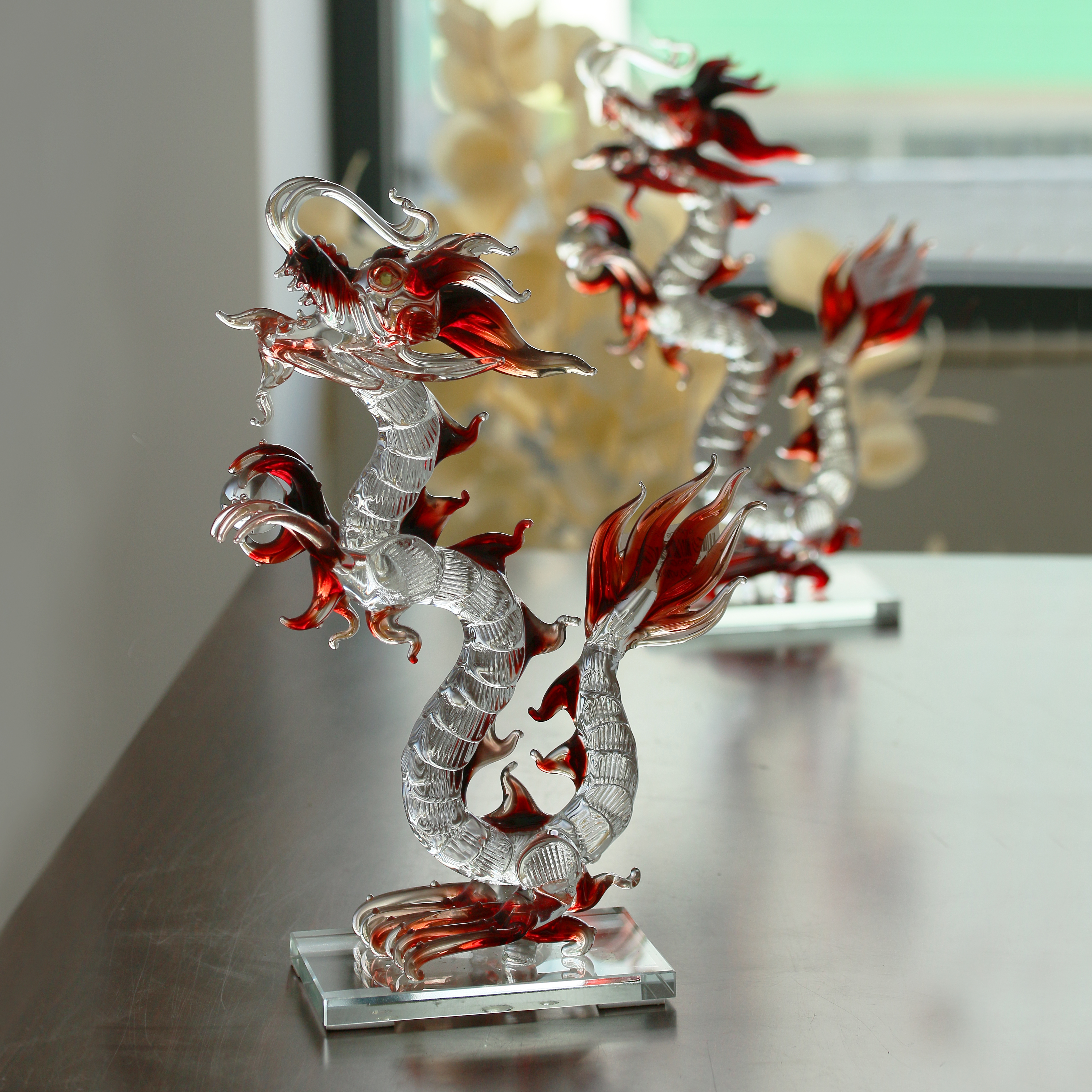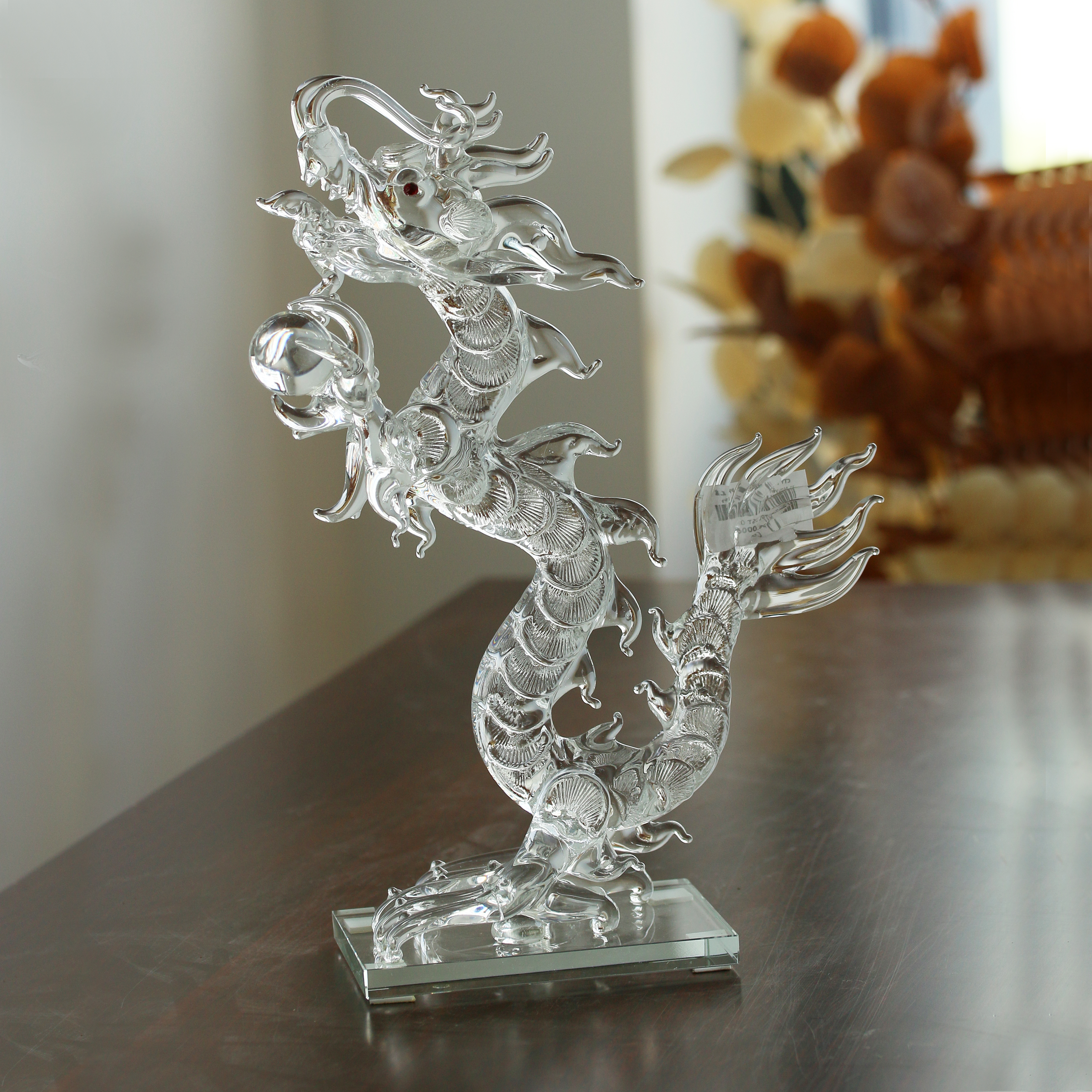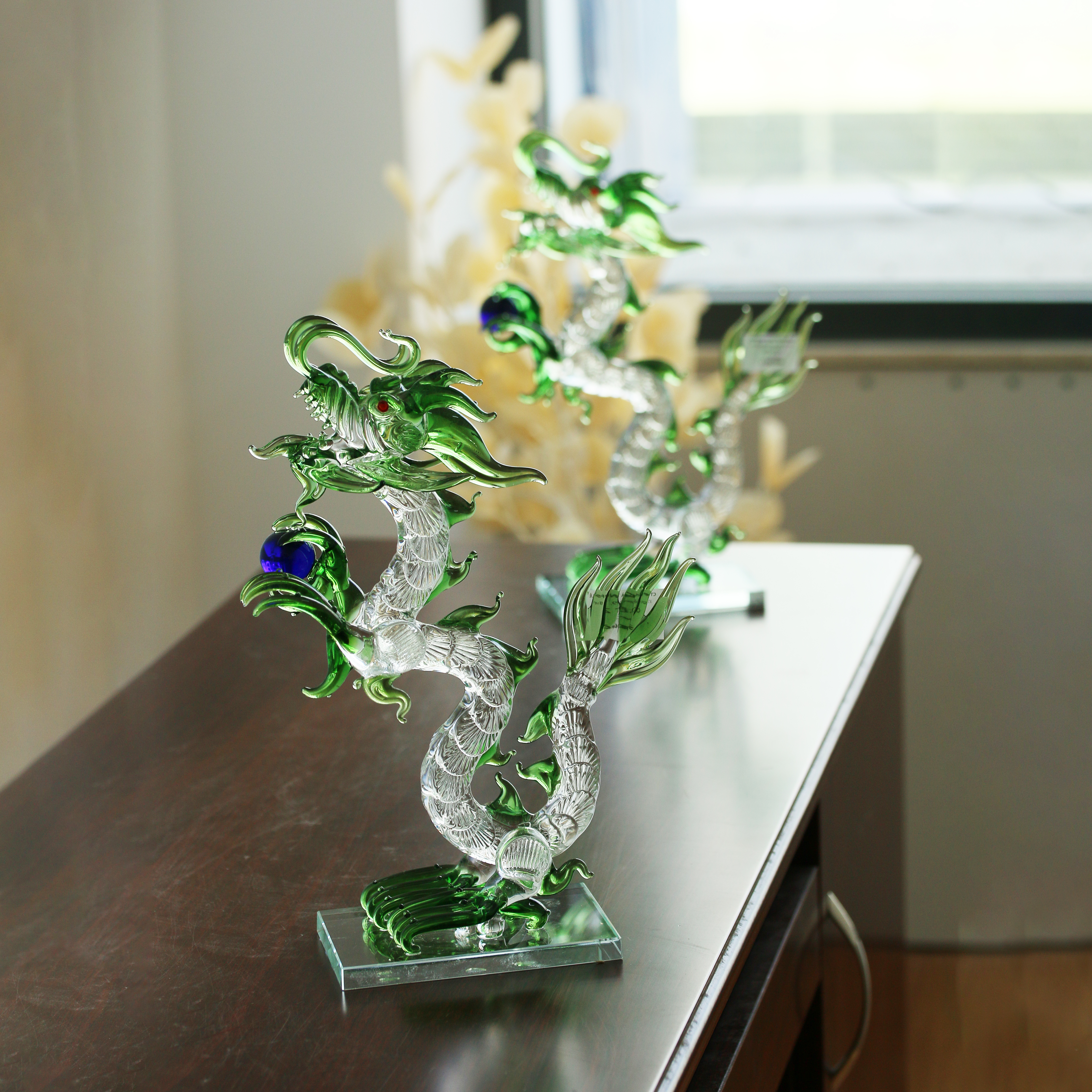 Tác phẩm được chế tác thủ công tinh xảo từ thủy tinh cao cấp, với từng đường nét uốn lượn mềm mại nhưng mạnh mẽ, tái hiện trọn vẹn thần thái uy nghiêm của linh vật. Hình ảnh rồng vươn cao, cầm viên ngọc quý trong tay, càng khẳng định vị thế của một bậc đế vương, mang lại năng lượng chiêu tài – khai vận – thăng tiến.