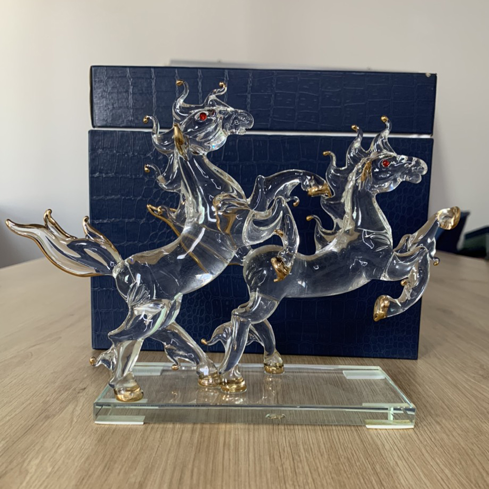 Tác phẩm được chế tác tinh xảo từ thủy tinh cao cấp, kết hợp cùng những chi tiết mạ vàng tinh tế ở bờm, đuôi và vó ngựa. Sắc trong suốt sang trọng, điểm xuyết ánh vàng kim lấp lánh giúp tượng Song Mã Phi Tiên vừa thanh thoát vừa quyền quý. Đây không chỉ là một món đồ trưng bày mà còn là vật phẩm phong thủy giàu năng lượng cát tường, mang đến sự may mắn và thịnh vượng cho gia chủ.